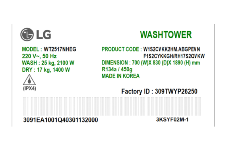 - Khối lượng giặt: Giặt 25 Kg - Sấy 17 Kg